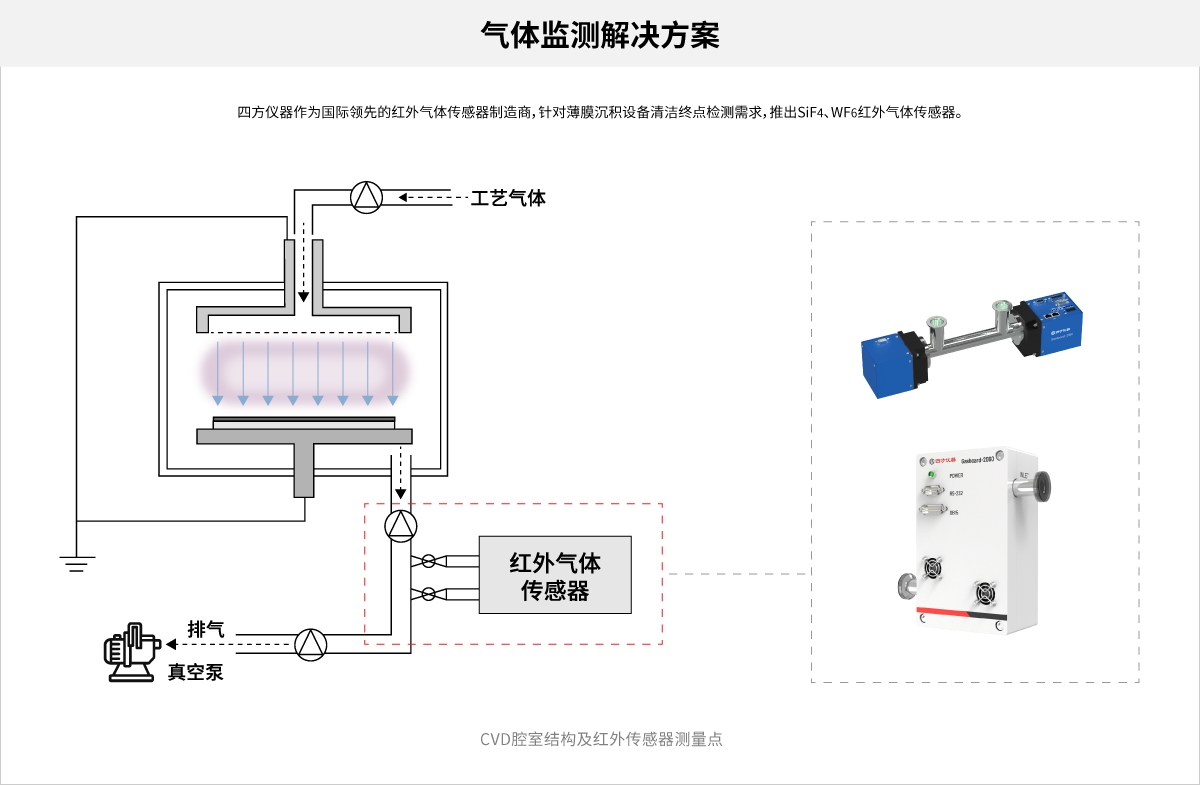 傳統(tǒng)方法依賴經(jīng)驗時間控制,但實(shí)際最佳清潔時間受沉積厚度、溫度、壓力等因素影響,且參數(shù)可能漂移。因此,多數(shù)工藝會延長清潔時間以確保徹底清潔,但造成資源浪費(fèi)。Johnson等(2004)提出通過監(jiān)測SiF?分壓確定清潔終點(diǎn)。紅外氣體傳感器因其高實(shí)時性和可靠性,已成為主流檢測手段。