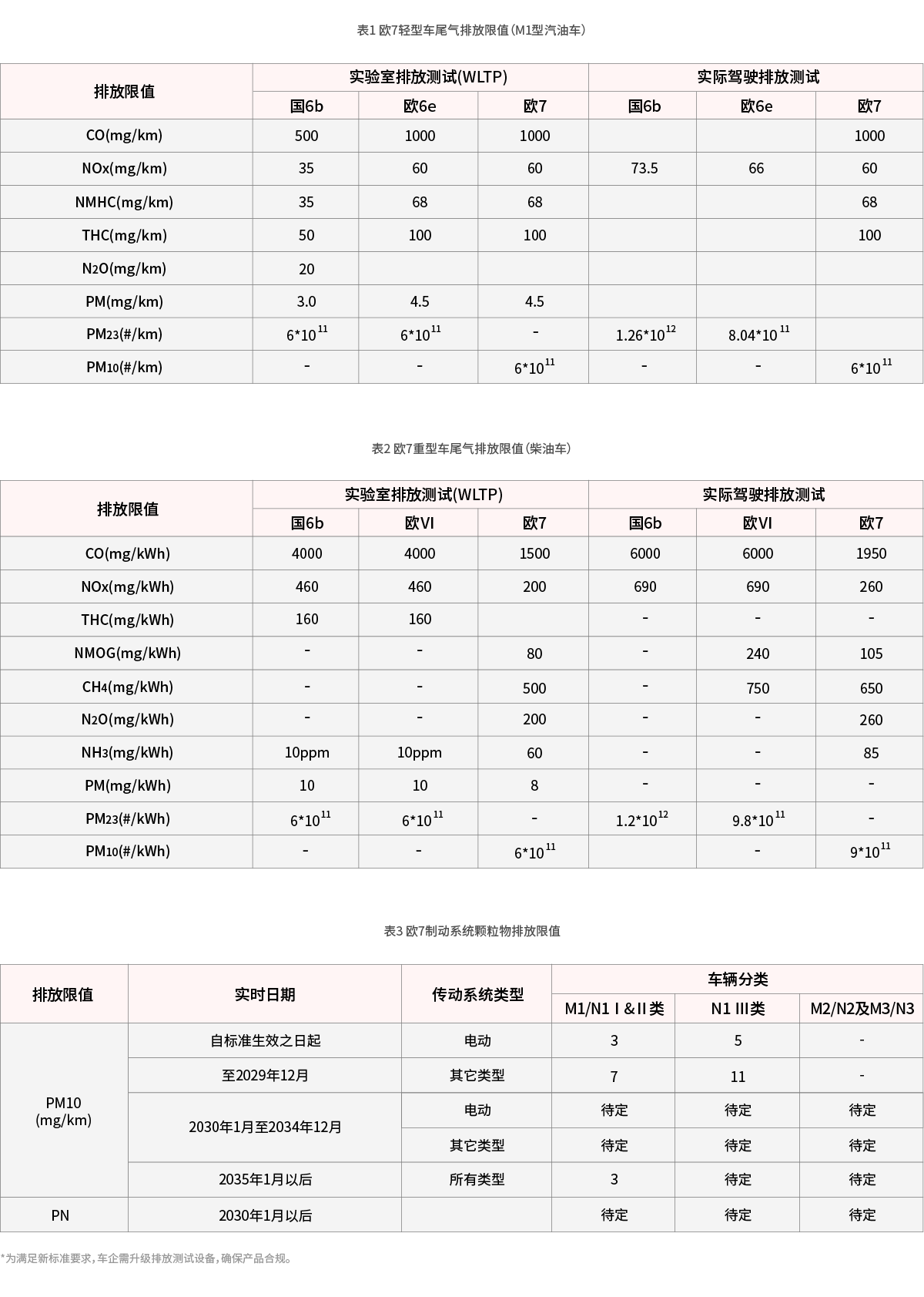 排放標(biāo)準(zhǔn)升級(jí)是機(jī)動(dòng)車污染減排的主要驅(qū)動(dòng)力。2024年歐盟發(fā)布的歐7標(biāo)準(zhǔn)不僅加嚴(yán)了尾氣污染物限值(表1-2),還新增了制動(dòng)系統(tǒng)和輪胎顆粒物排放檢測要求(表3)。我國生態(tài)環(huán)境部自2020年啟動(dòng)國七標(biāo)準(zhǔn)預(yù)研,目前第三期預(yù)研已進(jìn)入標(biāo)準(zhǔn)制定階段,國七標(biāo)準(zhǔn)即將出臺(tái)。